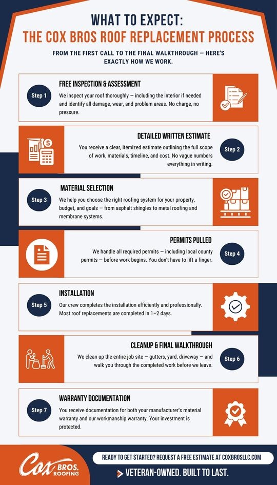 Cox Bros. Roofing completes each step with a focus on consistency and accountability. Homeowners are kept informed throughout the project, and the job is completed with minimal disruption to daily life. Clear communication and a structured approach help ensure the project stays on track from start to finish.